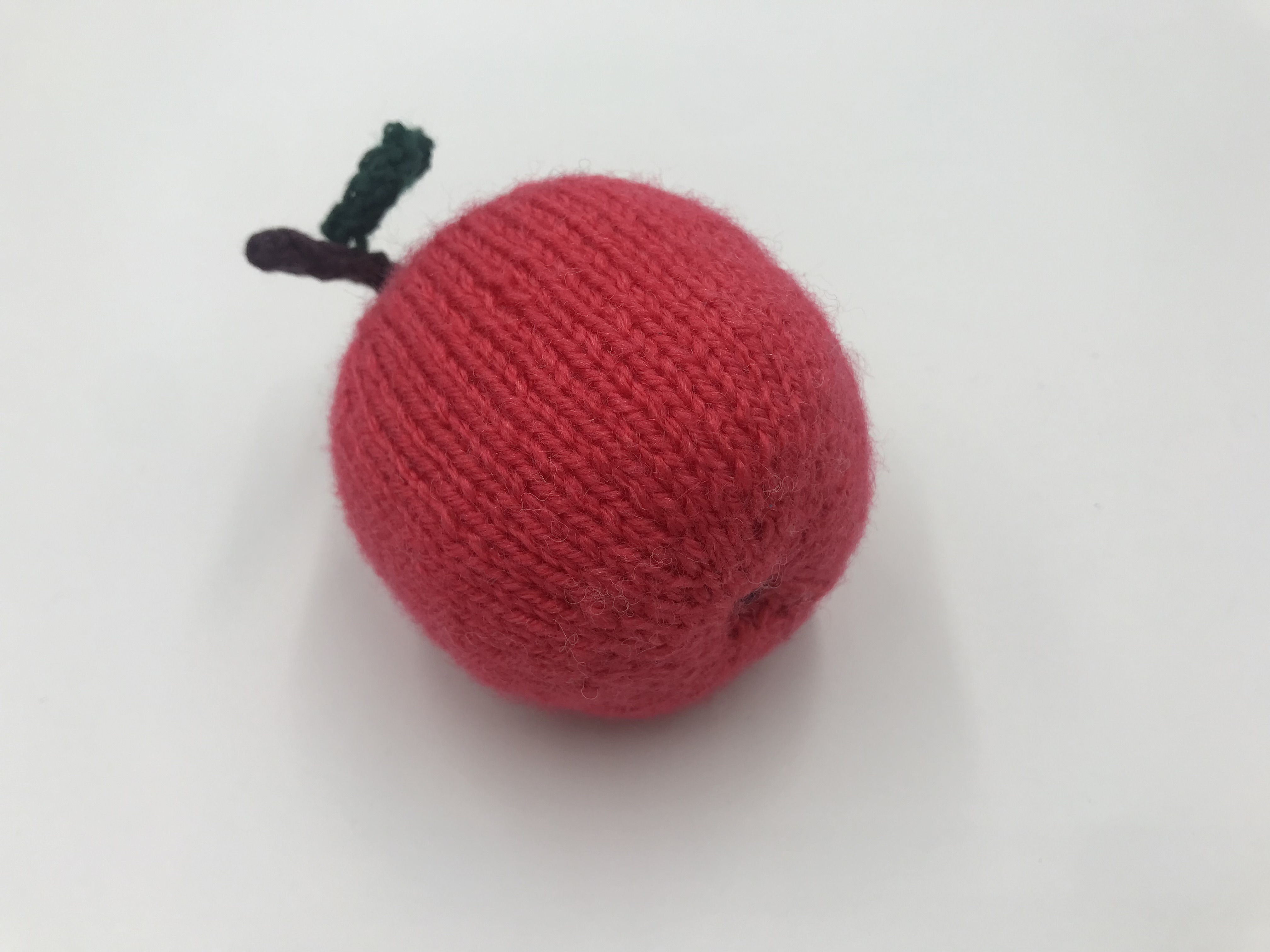 46.řada - všechna oka přetáhneme přes první oko a ukončíme. necháme dlouhou nit a s ní jablíčko sešijeme. Během sešívání vycpeme. Nakonec protáhneme nit jablkem z jedné strany na druhou a zase zpět. Tím vytvoříme prohlubeň pro umístění stopky na jedné straně a "bubák" na druhé straně.