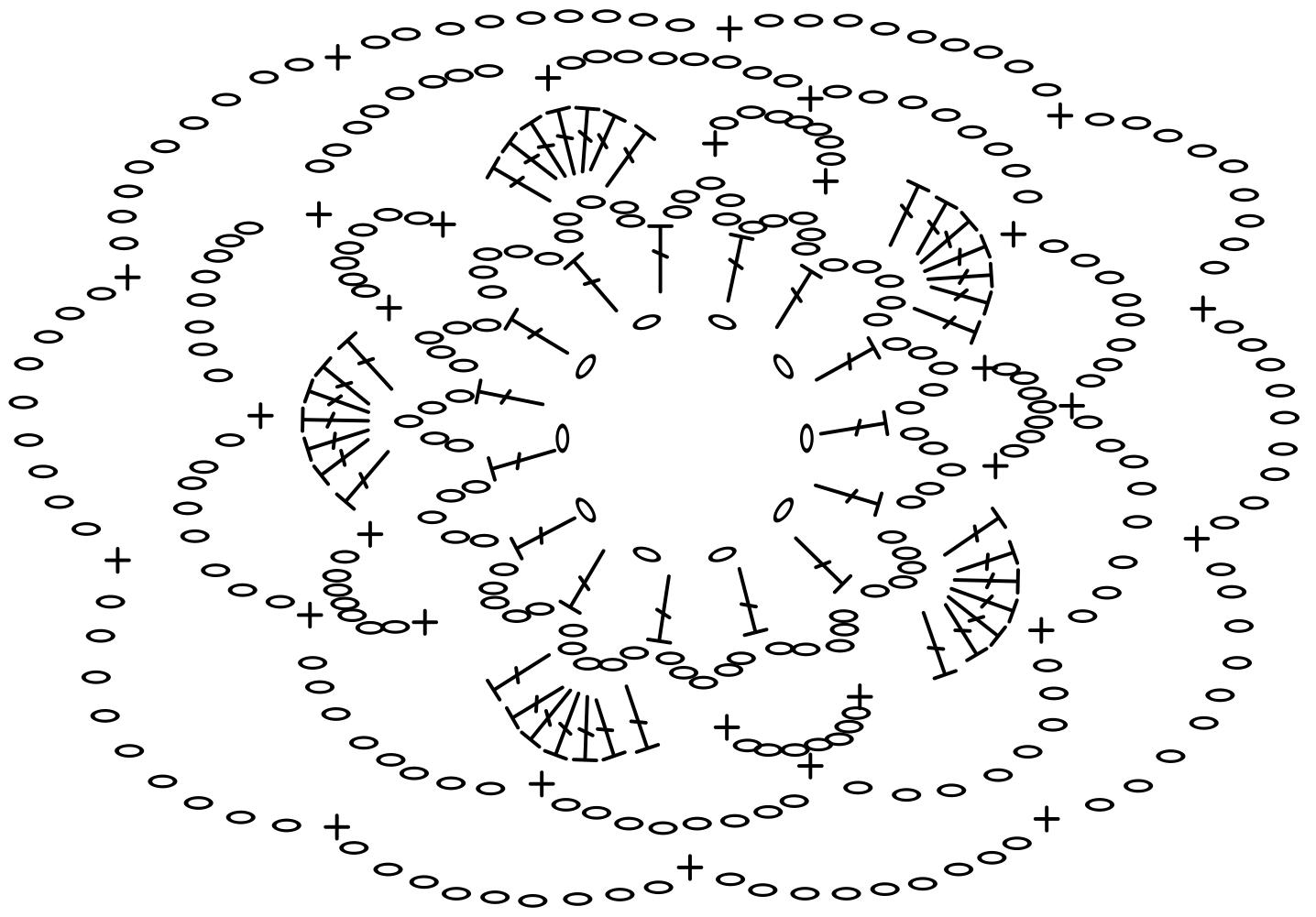 4.řada - 7 dlouhých sloupků nad 5 řetízkovými oky , pevné oko nad dalšími 5 řetízkovými oky, 7 řetízkových ok , pevné oko - celé opakujeme 5x